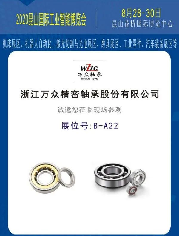 2020昆山國際工業智能展覽會暨2020昆山機械與智能制造展覽會將于2020年8月28日至30日在昆山花橋國際博覽中心舉行,浙江萬眾精密軸承股份有限公司(即萬馬軸承生產基地)也應邀參展,展位設在B號館A22,敬請廣大客戶朋友前來參觀洽談!